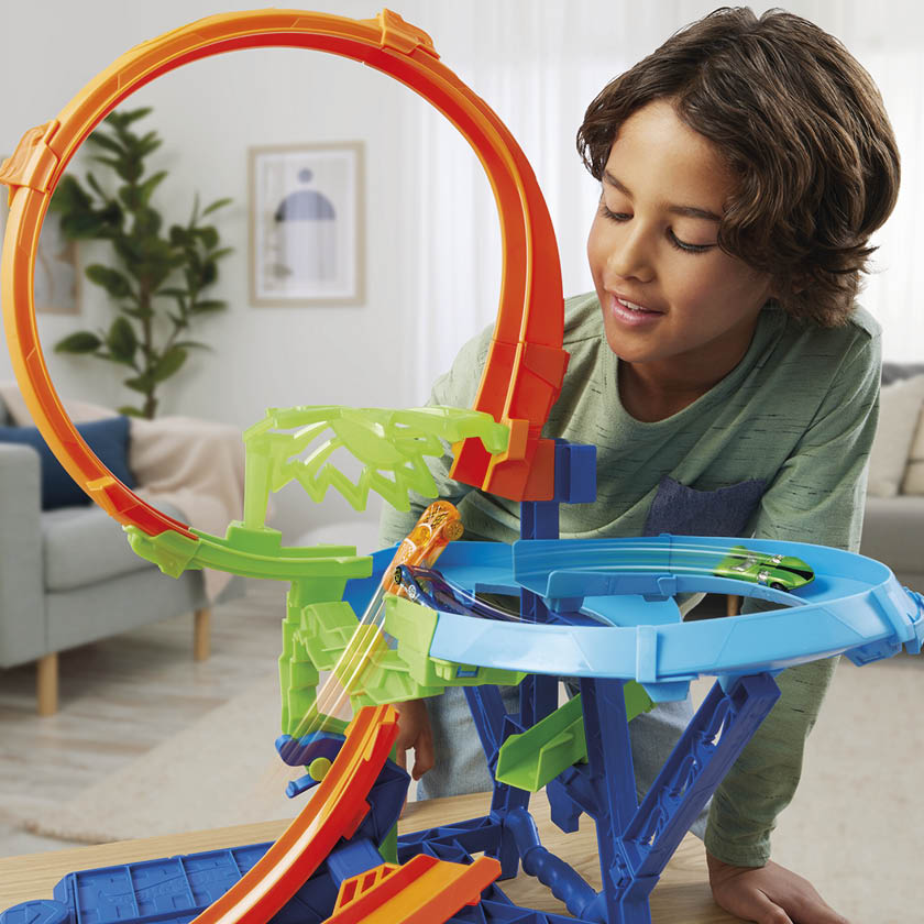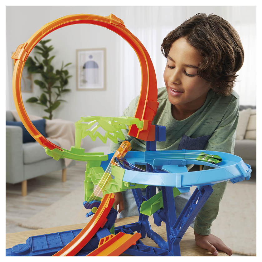 Autoradalla pikkuauto lentää silmukasta kahdeksikkokurviin, luvassa siis huikeita hyppyjä, silmukoita ja eeppisiä törmäyksiä. Moottoroitu laukaisin takaa vauhdin. Mukana rata-adapterit vanhoihin setteihin ja yksi pikkuauto. Kokoontaittuva. Paristokäyttöinen.